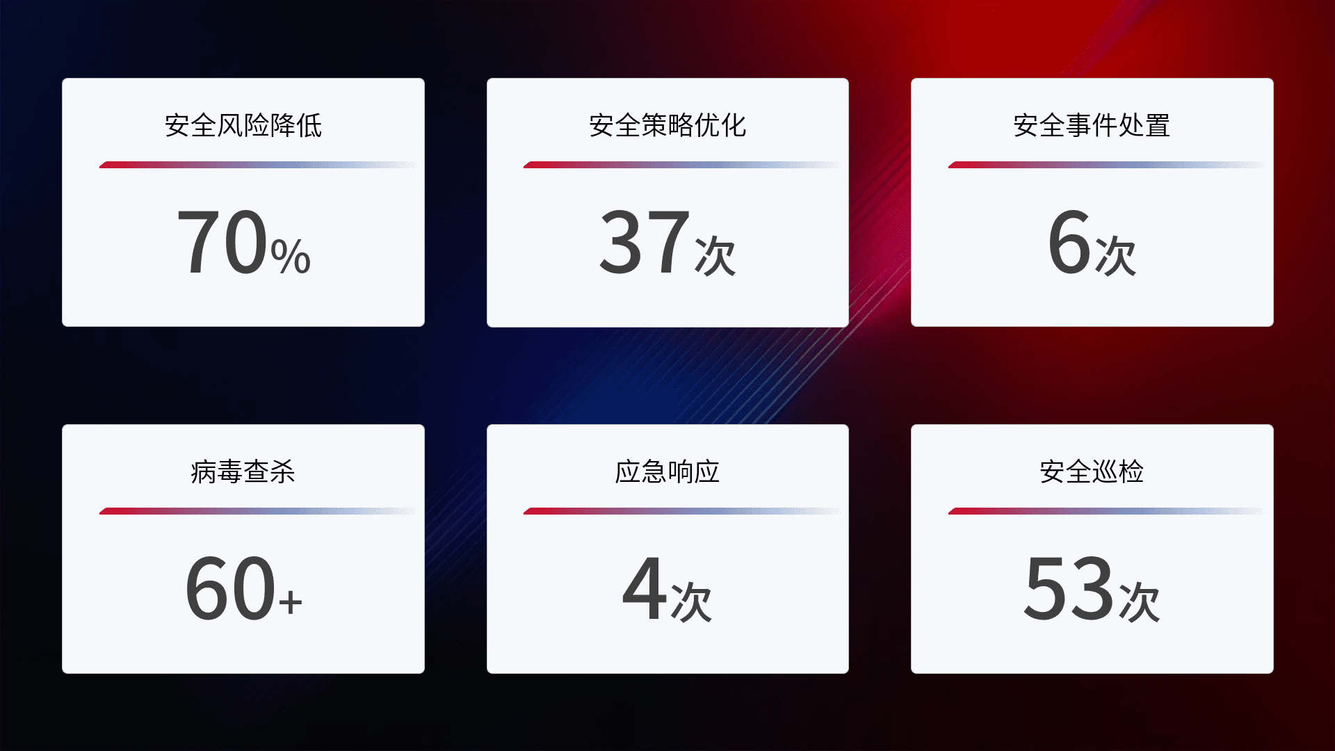 提供全面的安全事件报告体系,,,,包括处置报告、、、周报、、、、季度和年度总结,,,结合持续监控,,,帮助客户深入了解网络安全状况。。。