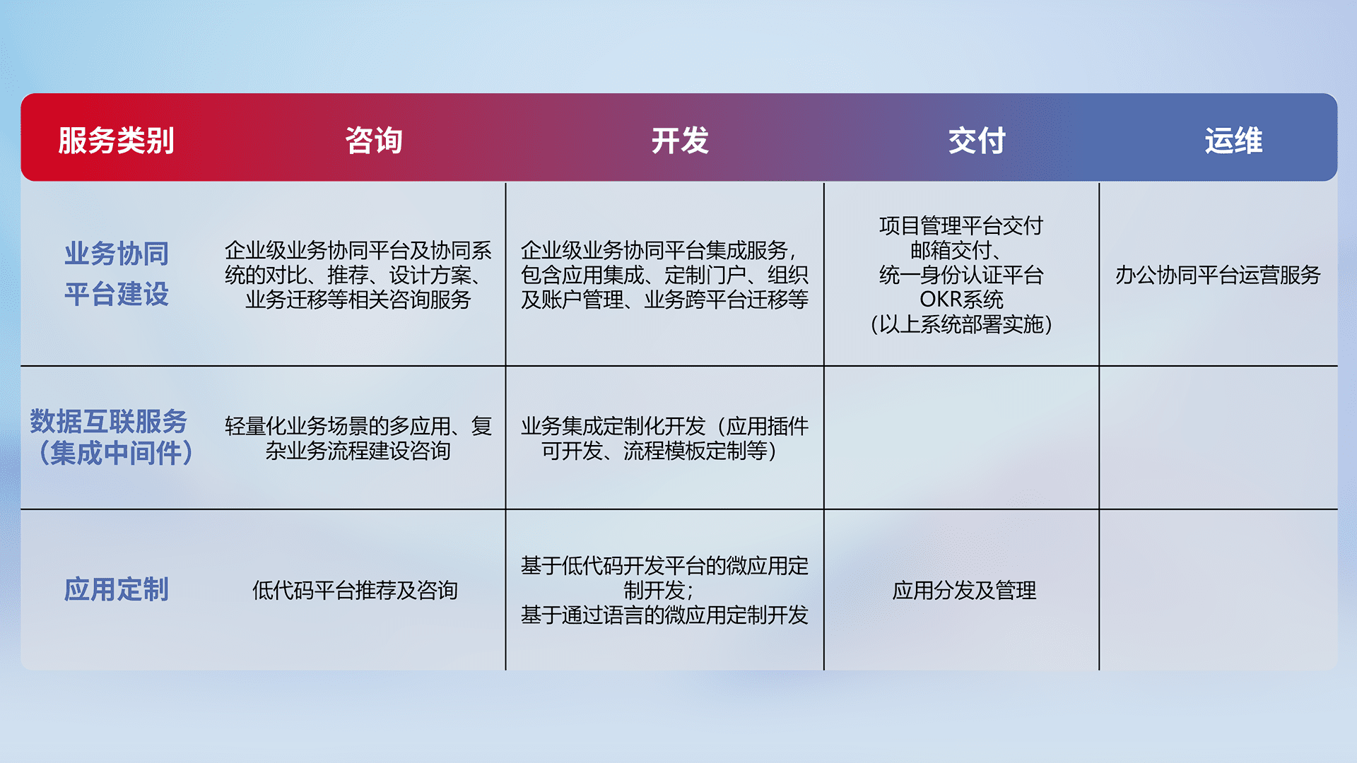 针对钉钉、、企微、、、、IDaas等平台级产品提供产品的规划、、、方案、、、交付、、、定制化开发等服务,,,实现如统一协同办公、、、智能客户服务、、混合会议管理、、智能数据查询、、等业务场景,,,实现数字化转型。。。。