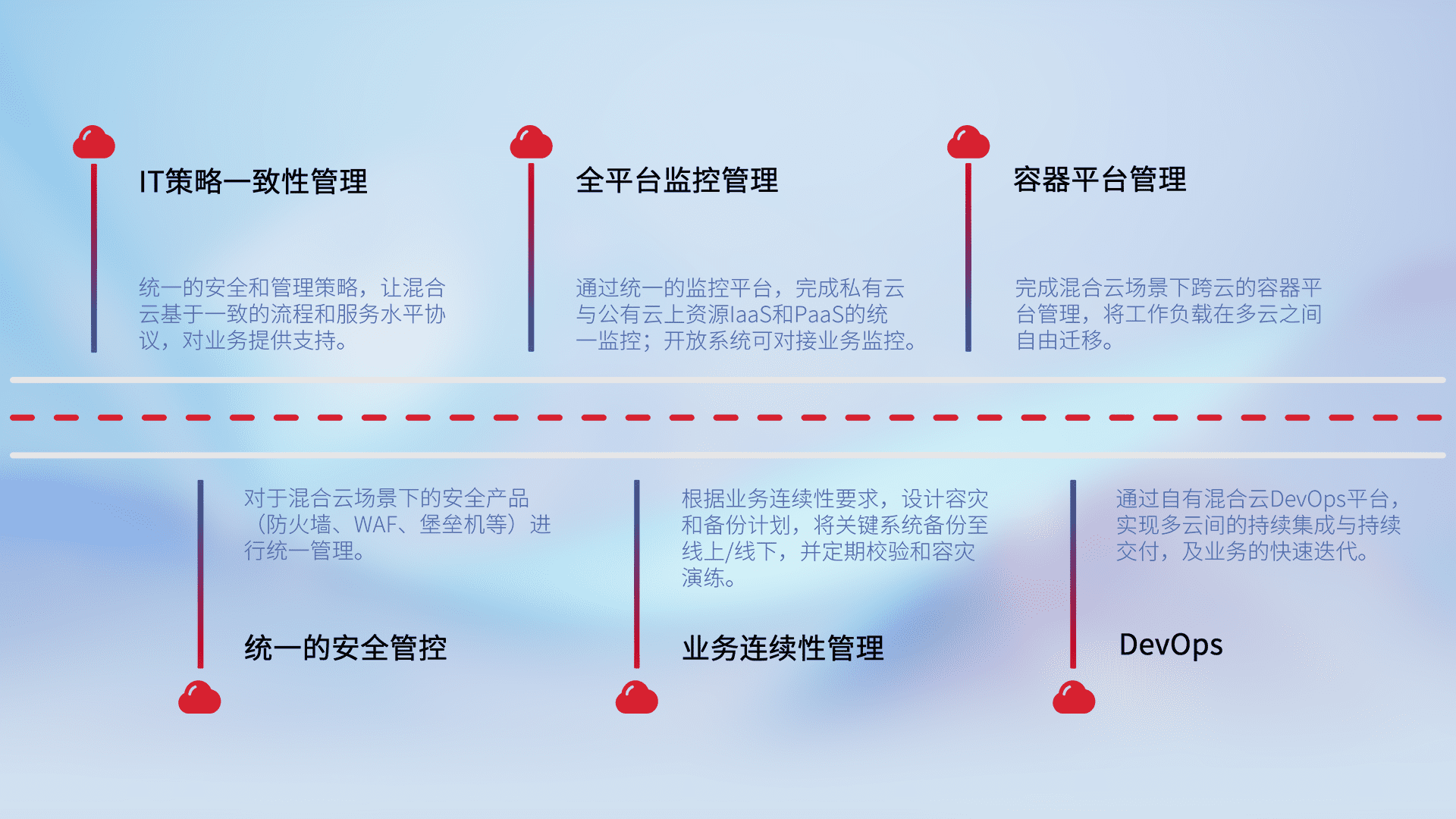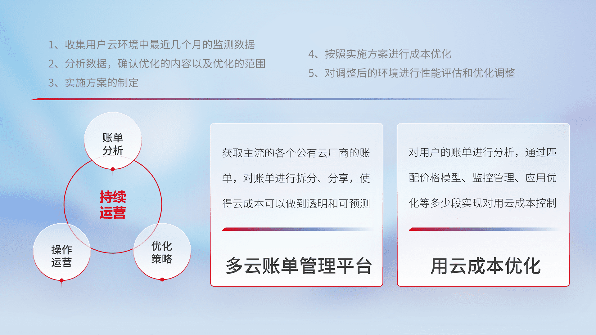 通过多云纳管,,,,以统一的资源数据模型把客户的云资源进行抽象和封装,,,,进而实现对多云资源的统一操作,,,保障云资源管理的可靠性、、稳定性与可用性。。。。量身定制化运维内容,,,,配置、、、开发运维、、补丁管理、、备份、、监控、、认证和访问管理、、、、审计和日常巡检等,,,,保障在用云过程中的可靠度,,稳定度以及高可用率。。。