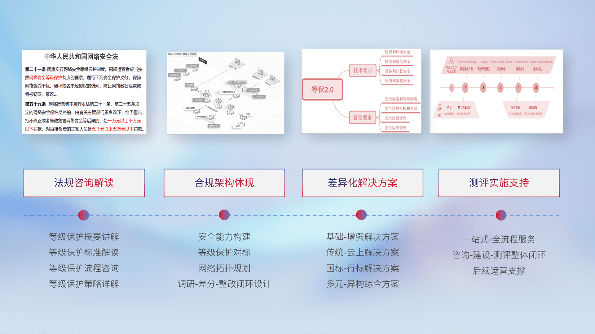 通过专业的法律咨询解读、、合规架构体现、、差异化解决方案、、、、测试实施支持等服务,,为客户量身打造等保合规体系。。。